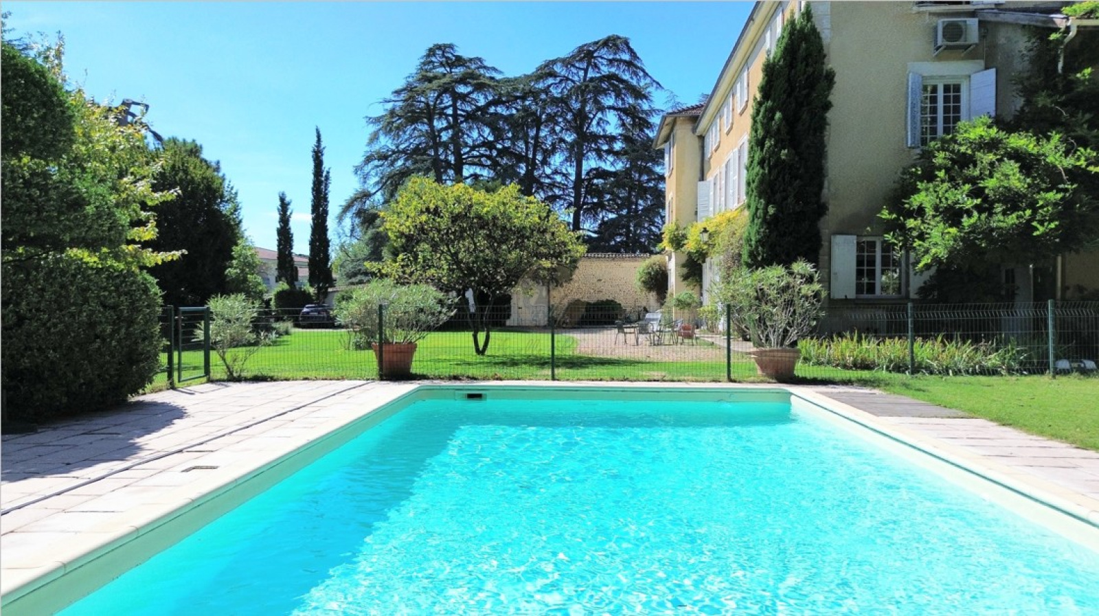 Le jardin paysager est entièrement clos de murs et abrite une piscine de 9,5 m sur 4,8 m avec couverture électrique, un puit permettant l’arrosage intégré et une belle variété d’arbres centenaires et fruitiers. Un parking à l’entrée de la propriété permet de stationner cinq véhicules.